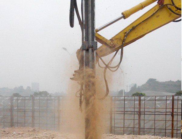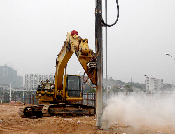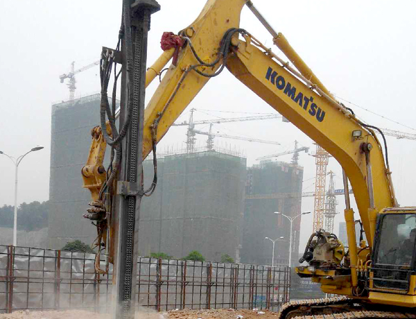 2、前后左右自由伸展,當(dāng)挖掘機在工地不平坦的情況下, 挖機手可根據(jù)位置不同調(diào)整鉆桿角度,保持90°垂直鉆孔。