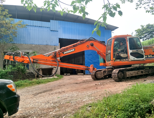 2、前后左右自由伸展,當(dāng)挖掘機(jī)在工地不平坦的情況下, 挖機(jī)手可根據(jù)位置不同調(diào)整鉆桿角度,保持90°垂直鉆孔。