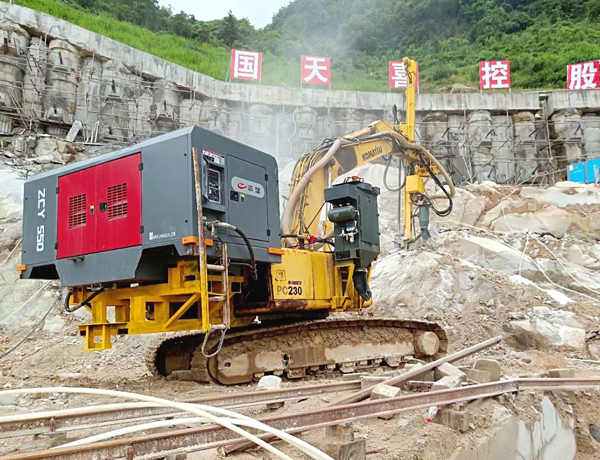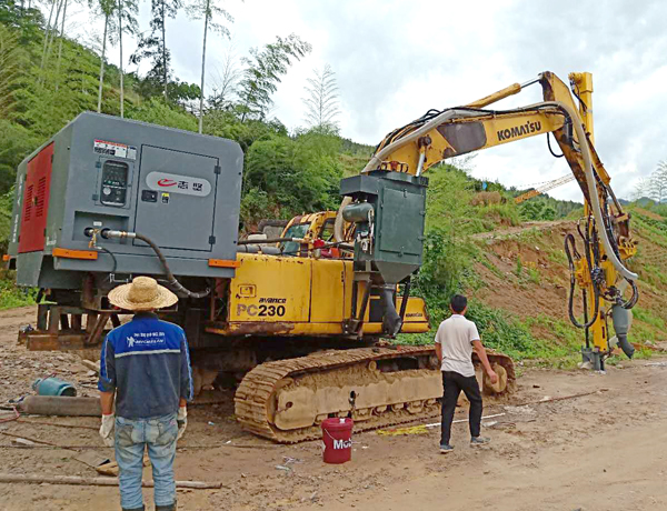 4、大功率空壓機,既可以單獨放置接氣管;也可以安裝于挖機的配重位置,與挖機鉆機自成一體,使用更為方便快捷。
