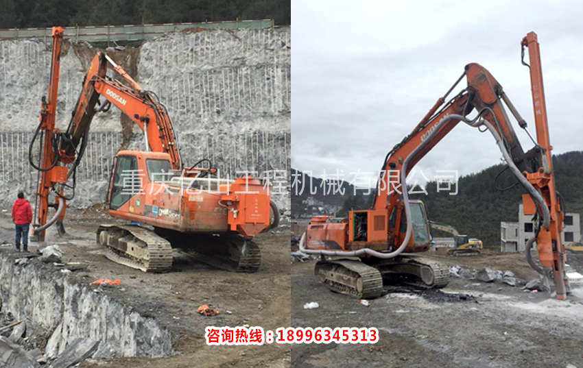 鑿巖鉆機是新式的挖改鉆機設(shè)備,效率很高,由液壓總成,鉆臂總成,空壓機總成(挖機一體),動力機頭,釬桿釬頭(耗材)幾大部件構(gòu)成,在工作原理上看起來類似切削鉆機,但是在動力機頭在液壓要求和液壓動力上有本質(zhì)區(qū)別,所需的鉆頭和釬頭也是不同的工作原理。鉆孔孔徑42-90mm(孔徑大小決定機頭的選擇),適用于高硬度石層,對一般的花崗石,石英石都能達(dá)到很好的效果,在一般的硬石上,打孔效率可達(dá)2-4米/分鐘,鉆臂軌道長度為3米或6米,打孔深度為6米。液壓總成提供液壓馬達(dá)的扭矩,空壓總成完成排渣工作。對液壓動力的要求較高,推薦改裝挖機低噸位10噸。