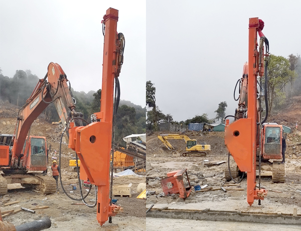 2、前后左右自由伸展,當(dāng)挖掘機(jī)在工地不平坦的情況下, 挖機(jī)手可根據(jù)位置不同調(diào)整鉆桿角度,保持90°垂直鉆孔。