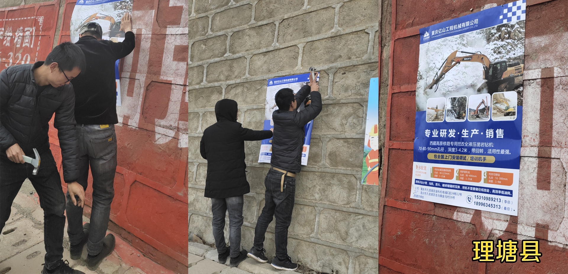 3月4日,公司李總率兩名工程師開著新買的四驅(qū)越野長城炮開啟西藏售后服務之旅,同時準備籌建西藏辦事處。沿著蜿蜒的川藏線,帥哥們一路欣賞美景,一路將我們億山挖改鉆機的宣傳畫貼在沿途的石壁上、工地外的架子上、修理廠外的矮墻上,為了西藏開發(fā)和建設,我們億山人愿意助一臂之力!在理塘、在巴塘、在芒康、在左貢、在八宿、在波密、在墨脫,到處都留下了我們工程師貼宣傳畫的身影!是的,他們來了,他們來了!為了更好的服務于客戶,億山人來到西藏,扎根西藏!愿西藏的明天更美好!